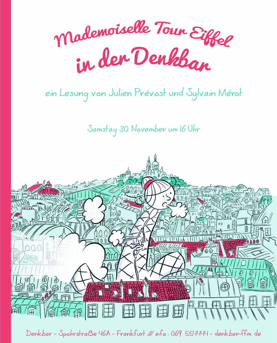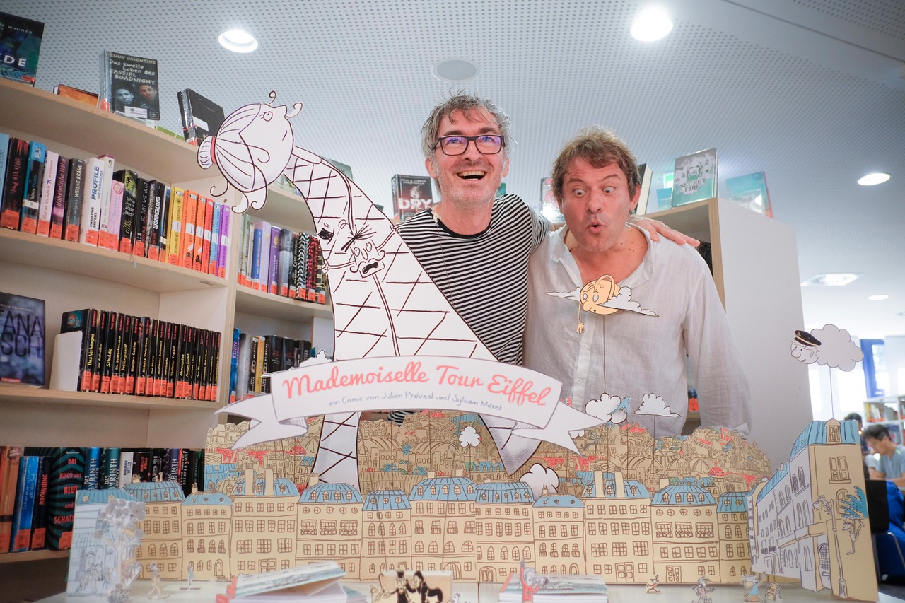 Sylvain Mérot und Julien Prévost performen ihren Comic „Mademoiselle Eiffelturm will ans Meer“ in verteilten Rollen mit Gesangs- und Musikeinlagen. Sehr charmant und mit viel französischem Humor. Uderzo und Goscinny lassen grüßen!