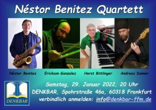 Die Formation ist neu, die Musiker sind in der DENKBAR teils bestens bekannt. Néstor Benitez hat mit Saxophon und Flöte bereits mehrere Bands und Solisten in der DENKBAR begleitet. Er lebt seit einiger Zeit in Frankfurt, nachdem er viele Jahre in seiner Heimat Peru und in ganz Lateinamerika musikalisch unterwegs und auch mit großen Namen wie Celia Cruz auf Tournee war. Wer Néstor schon gehört hat, wird sich an seine besondere Spielfreude und große Kreativität erinnern. Er wird begleitet von Horst Bittlinger am Piano, der dem Publikum der DENKBAR von den Latino-Bands HUEPA und Maray Montalvo Combo bekannt ist. Erstmals in der Denkbar spielen der venezolanische Schlagzeuger Erickson Gonzalez und der Frankfurter Bassist Andreas Donner.